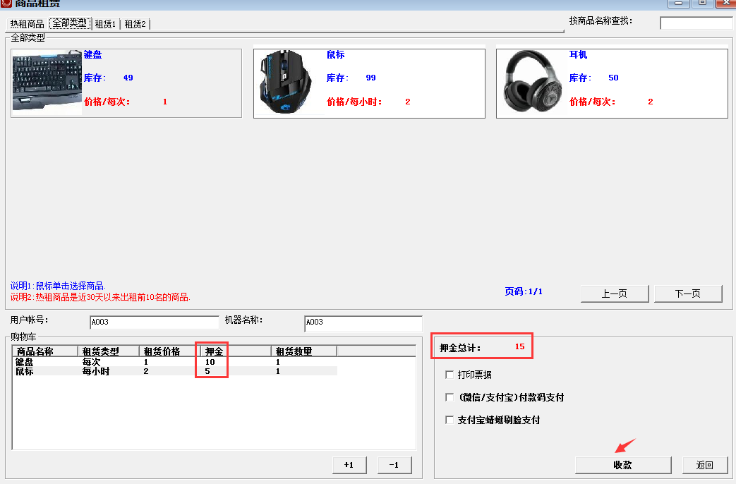 选择要租赁的商品, 租赁商品采用收取押金的方式, 收款成功即开始租赁.