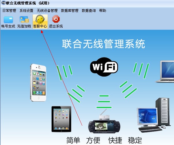 首先打开 "联合无线管理系统 " 点击工具栏中的 "客服中心" ,如下图