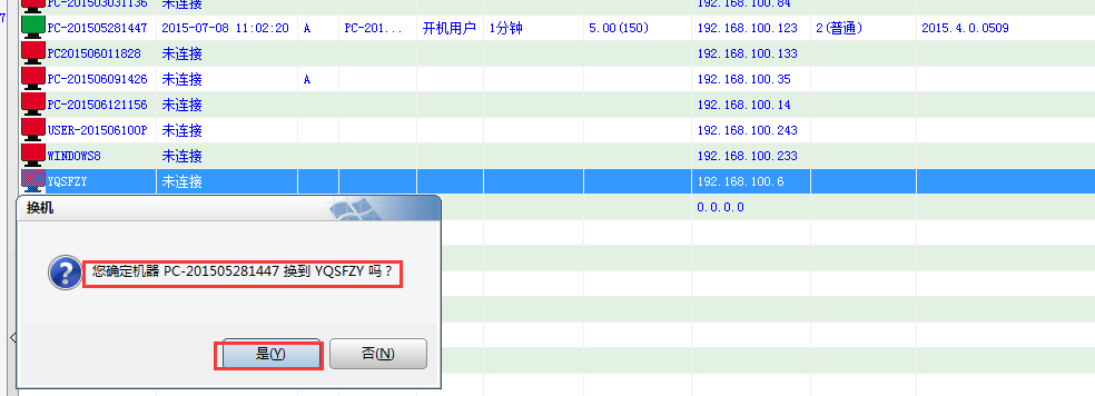 注:客户端使用换机功能要保证服务端设置了允许才可以.(在服务端软件菜单中 "系统设置--设置参数---手动开机设置"可以设置)