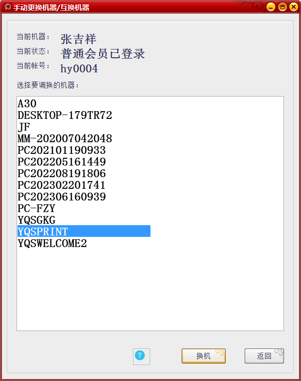 选择您所需要换机的机器名就可以换机成功了。