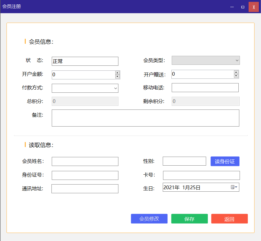 会员注册信息,可以设置开户金额,赠送,付款方式,移动电话等