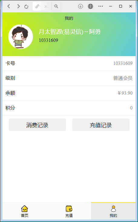 顾客点击 "我的" ,可以看到个人卡号信息, 并且可以查询消费记录和充值记录.