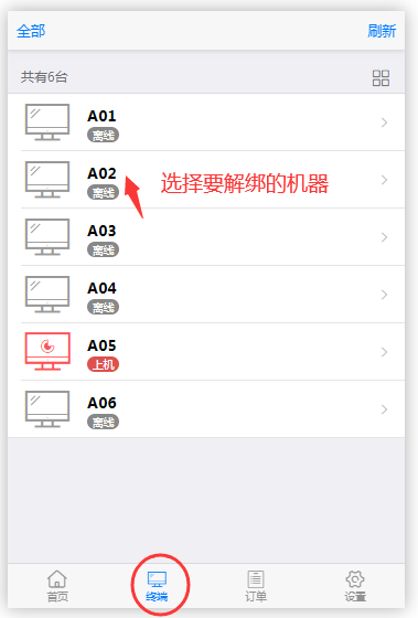 进入手机管理界面, 选择终端, 选择要解绑的机器