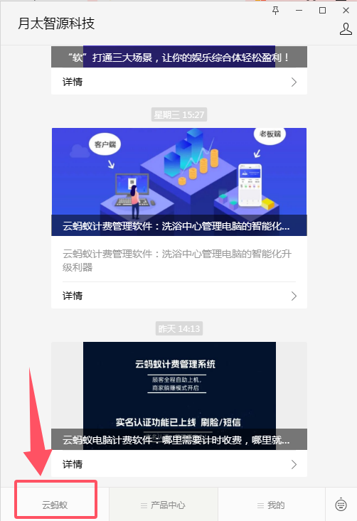 通过微信搜索 月太智源科技 服务号 进入云蚂蚁软件管理后台-- 右下角 找到 云蚂蚁 点击进入