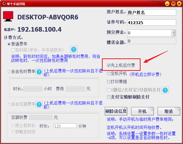 (如果没有先上机后付费选项或者选项是灰色的,可以在软件的系统设置 --设置参数 --开卡与充值设置 里面把先上机后付费的选项勾选上)