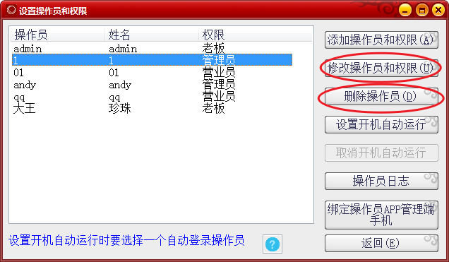 首先点击选择的操作员,之后点击修改或者是删除,即可修改操作员的权限或者是删除操作员