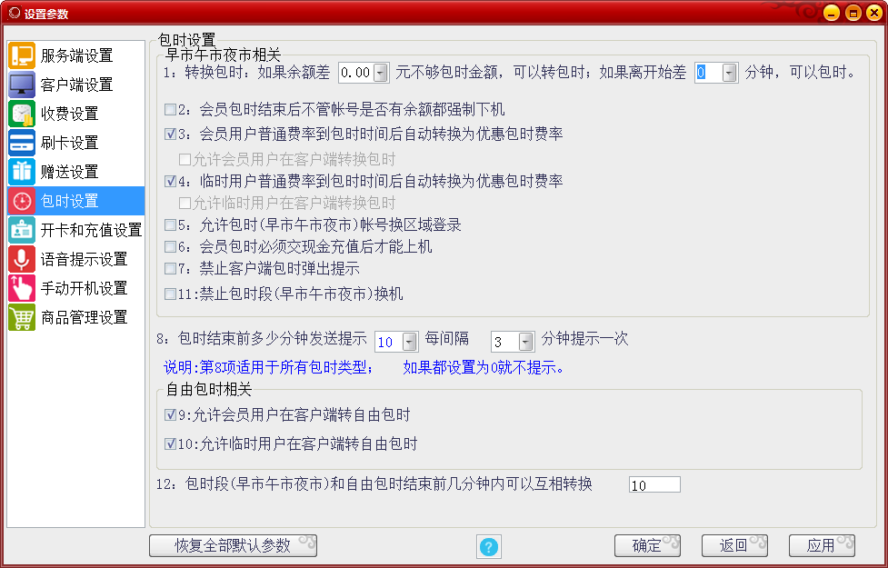 这两项设置如果勾选启用,则是自动转包时,在进入包时后先按普通费率计费,扣够包时钱后自动转成包时