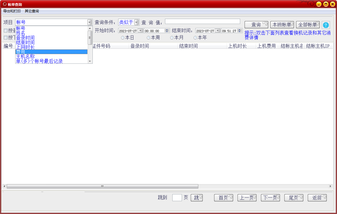 摇钱树网吧管理软件如操作员想要查询当班的收入账单或是某个用户的上机记录。可以点击 数据查询-账单查询 功能,弹出如下所示: