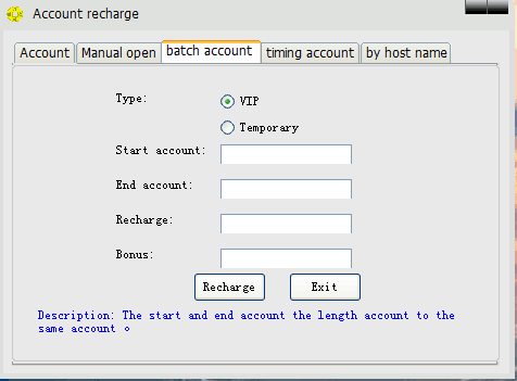 充值包含:以账号充值、手动开机充值、批量充值、计时账号充值、按机器名充值