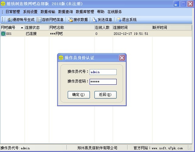 然后点一下“系统设置”——“连锁网吧信息设置”,然后进入操作员身份验证,系统默认的代号和密码都是“admin”,进入如下界面: